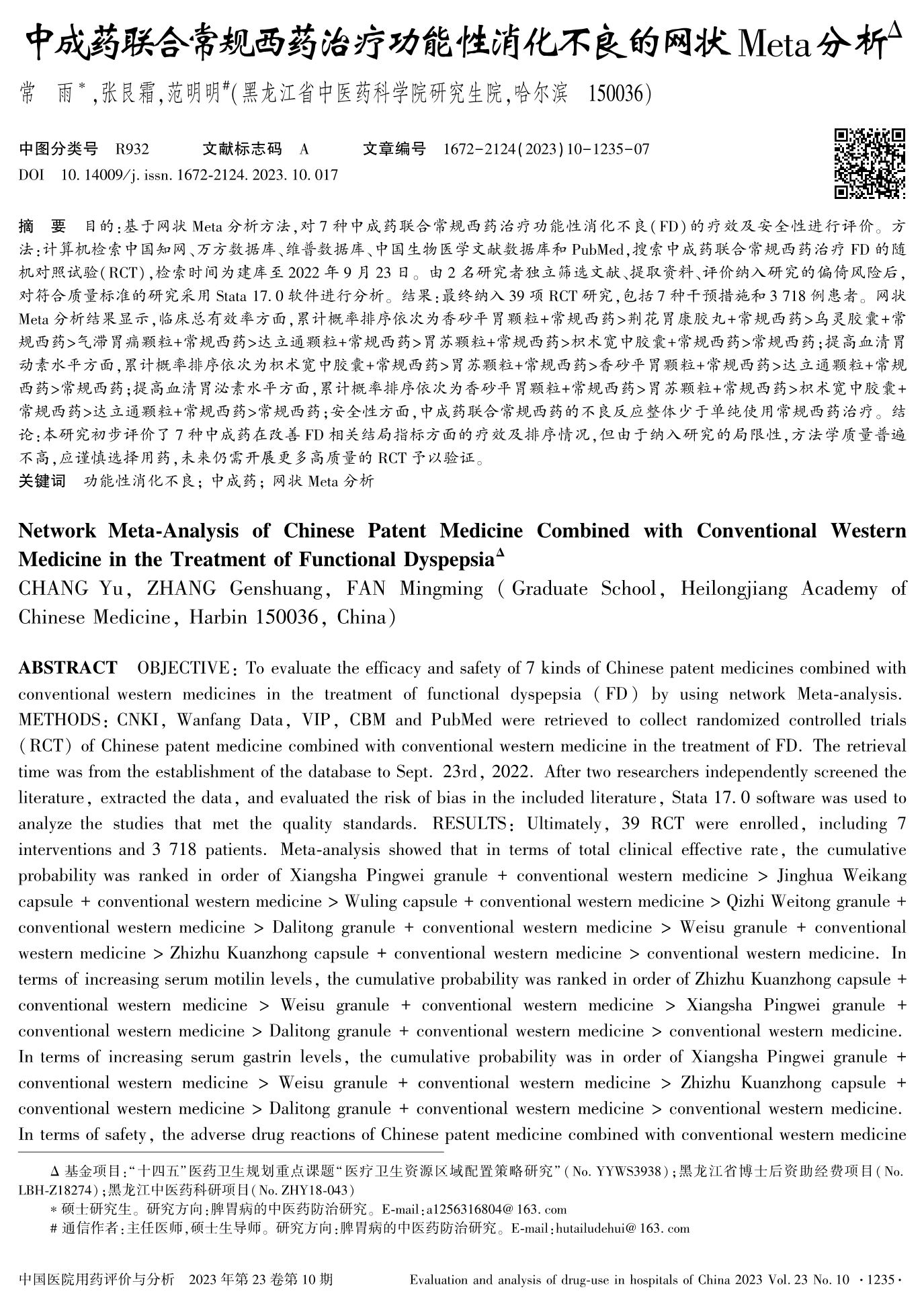 中成藥聯(lián)合常規(guī)西藥治療功能性消化不良的網(wǎng)狀Meta分析