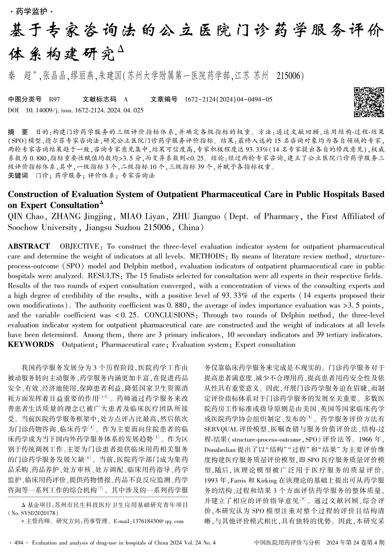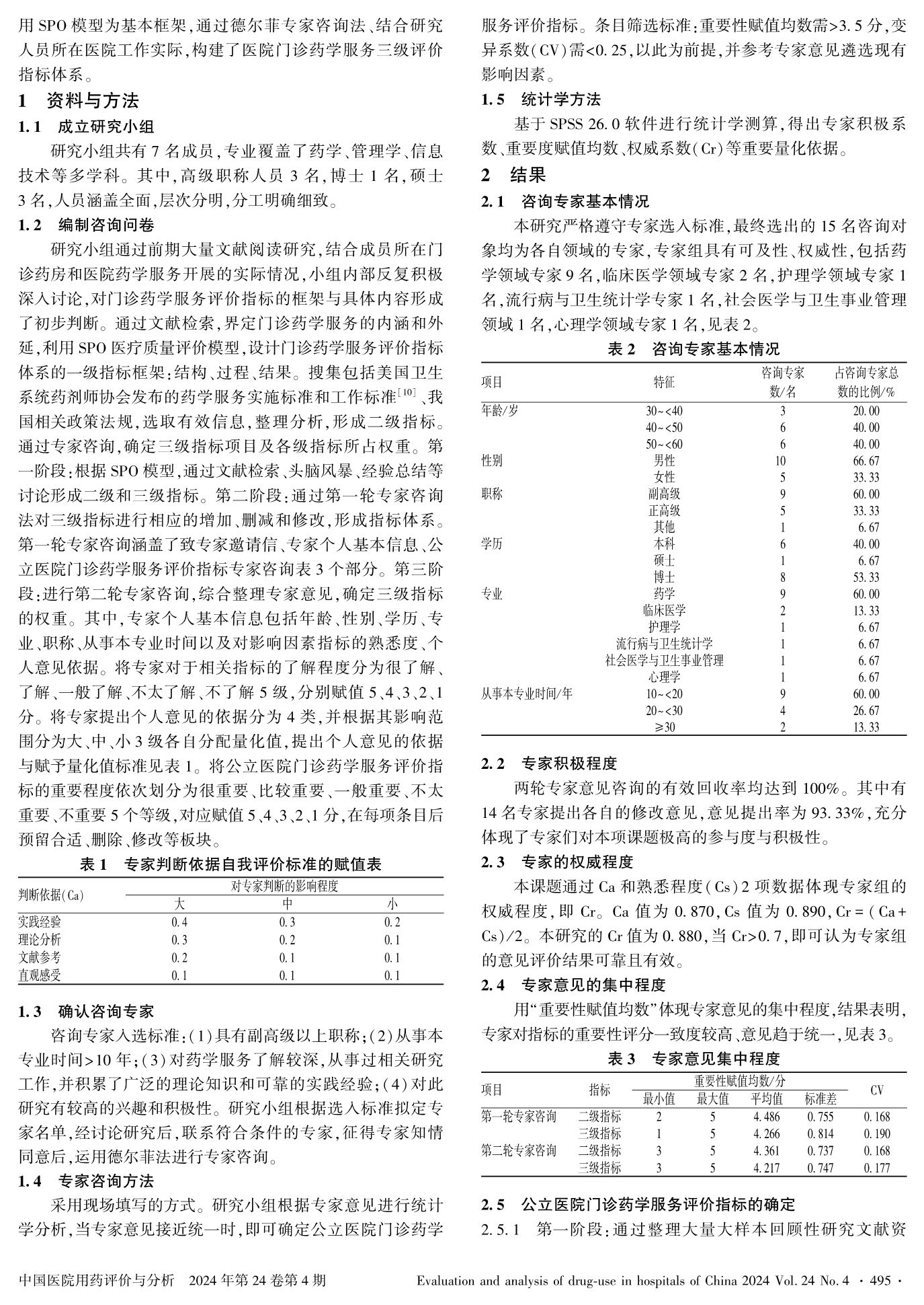 Construction of Evaluation System of Outpatient Pharmaceutical Care in Public Hospitals Based on Expert Consultation