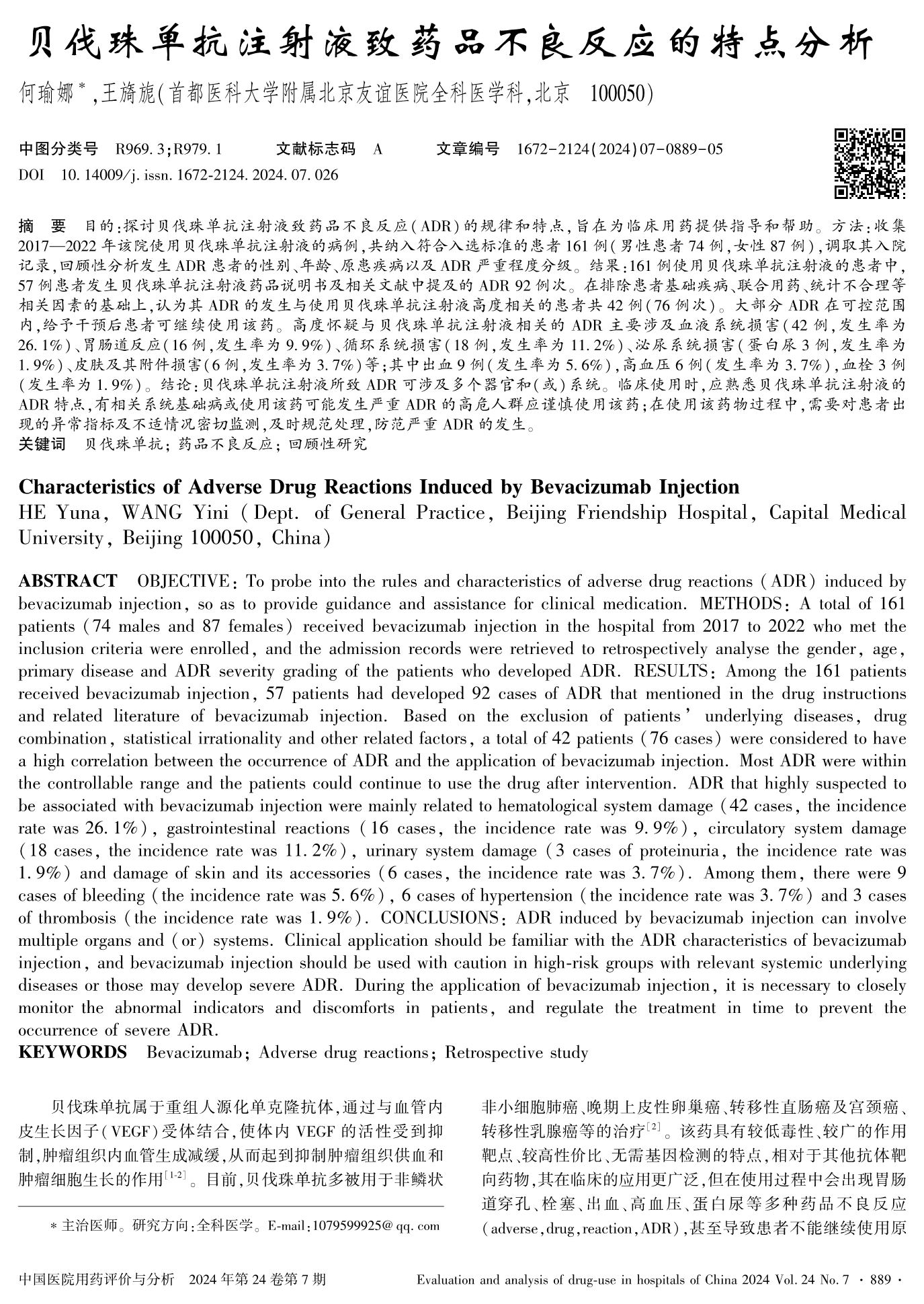 Characteristics of Adverse Drug Reactions Induced by Bevacizumab Injection