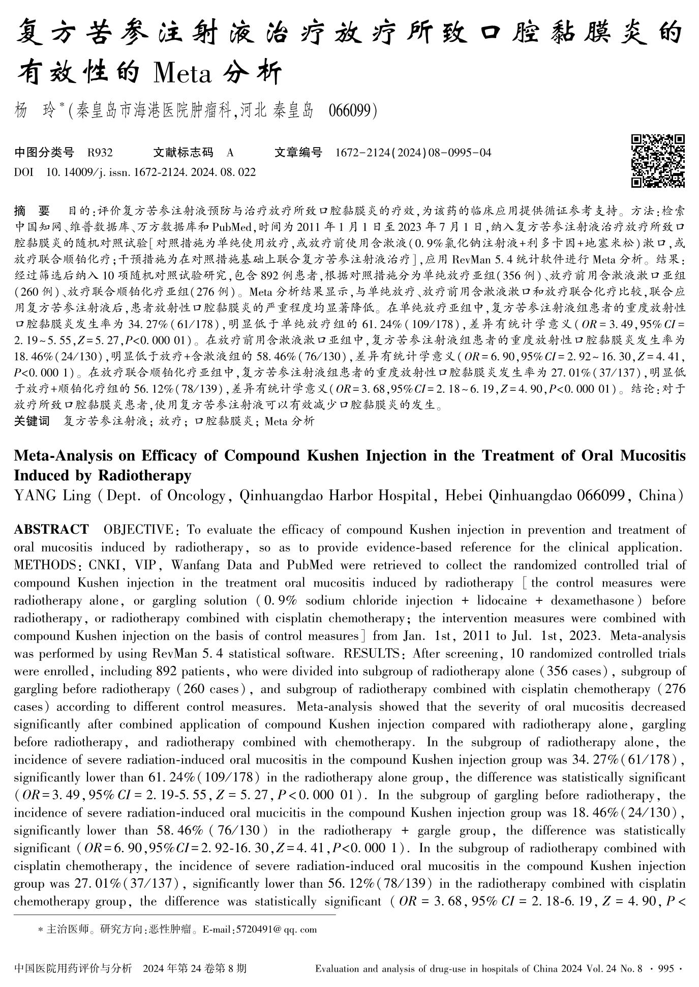 復(fù)方苦參注射液治療放療所致口腔黏膜炎的有效性的Meta分析