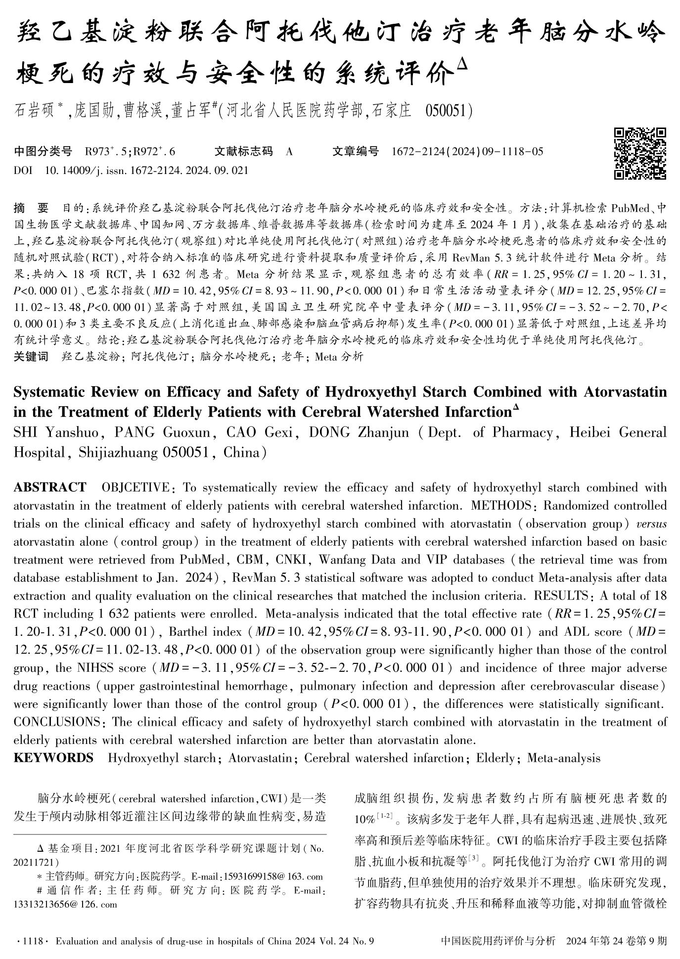 羥乙基淀粉聯(lián)合阿托伐他汀治療老年腦分水嶺梗死的療效與安全性的系統(tǒng)評價