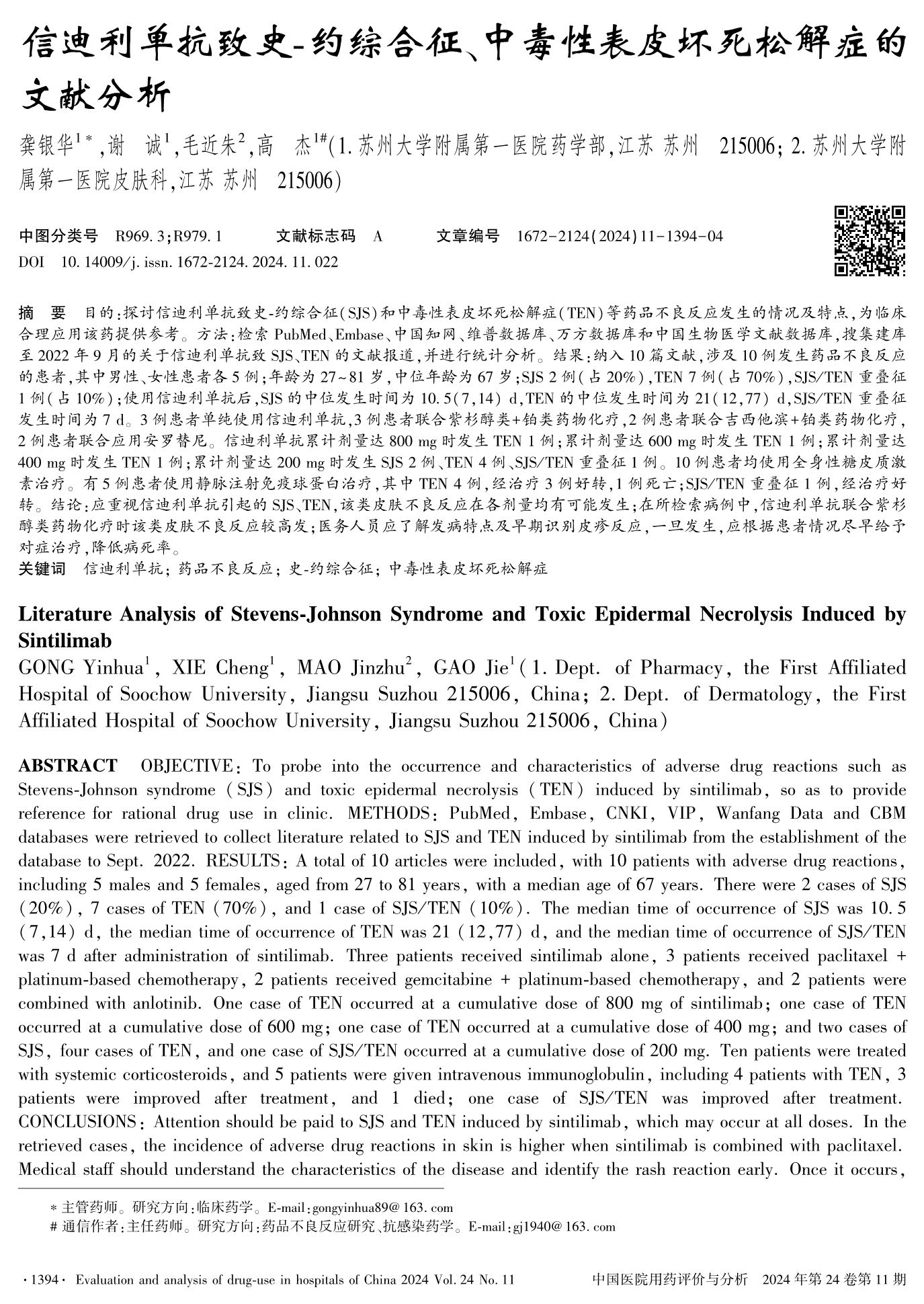 信迪利單抗致史-約綜合征、中毒性表皮壞死松解癥的文獻(xiàn)分析