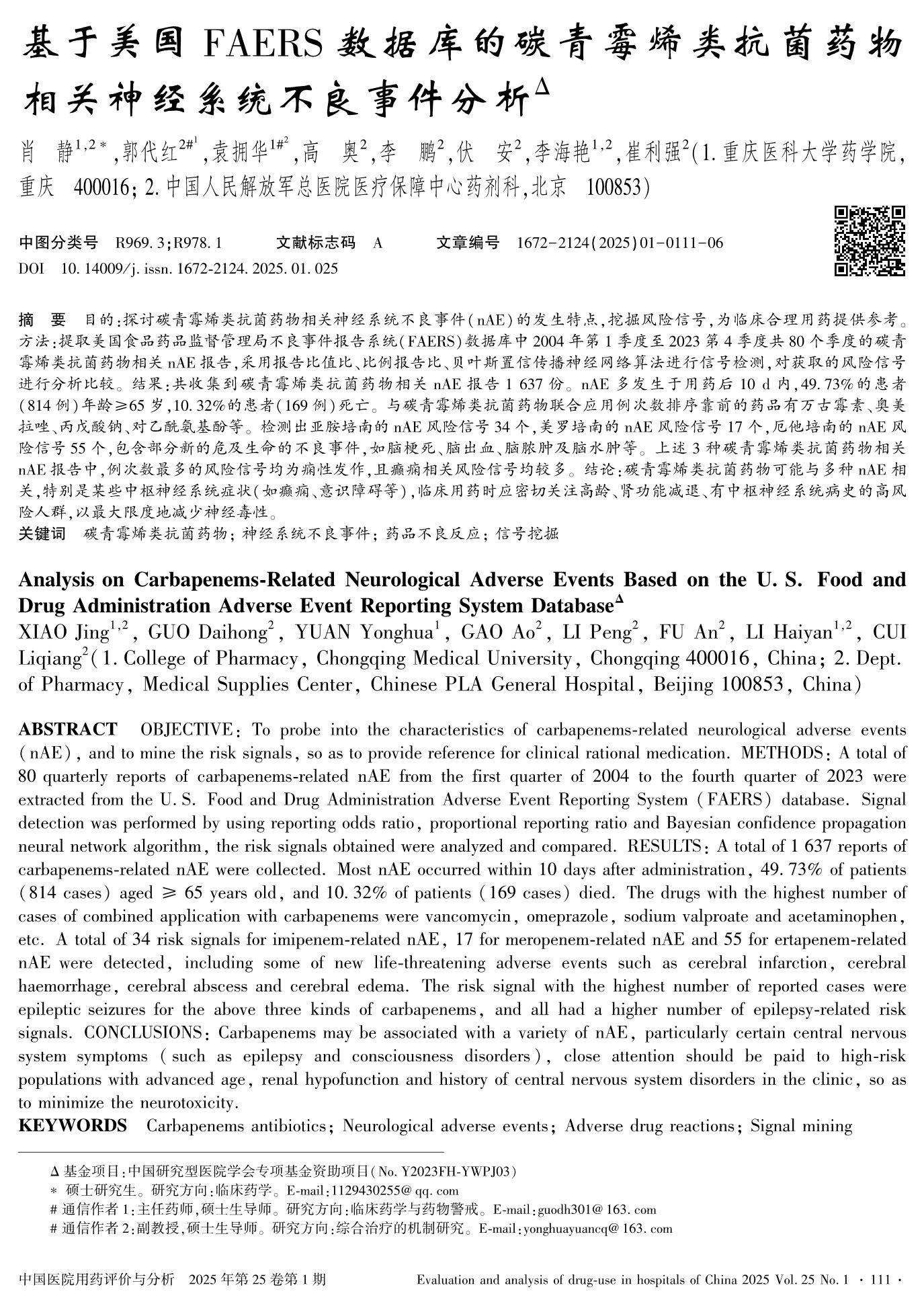 基于美國(guó)FAERS數(shù)據(jù)庫(kù)的碳青霉烯類抗菌藥物相關(guān)神經(jīng)系統(tǒng)不良事件分析