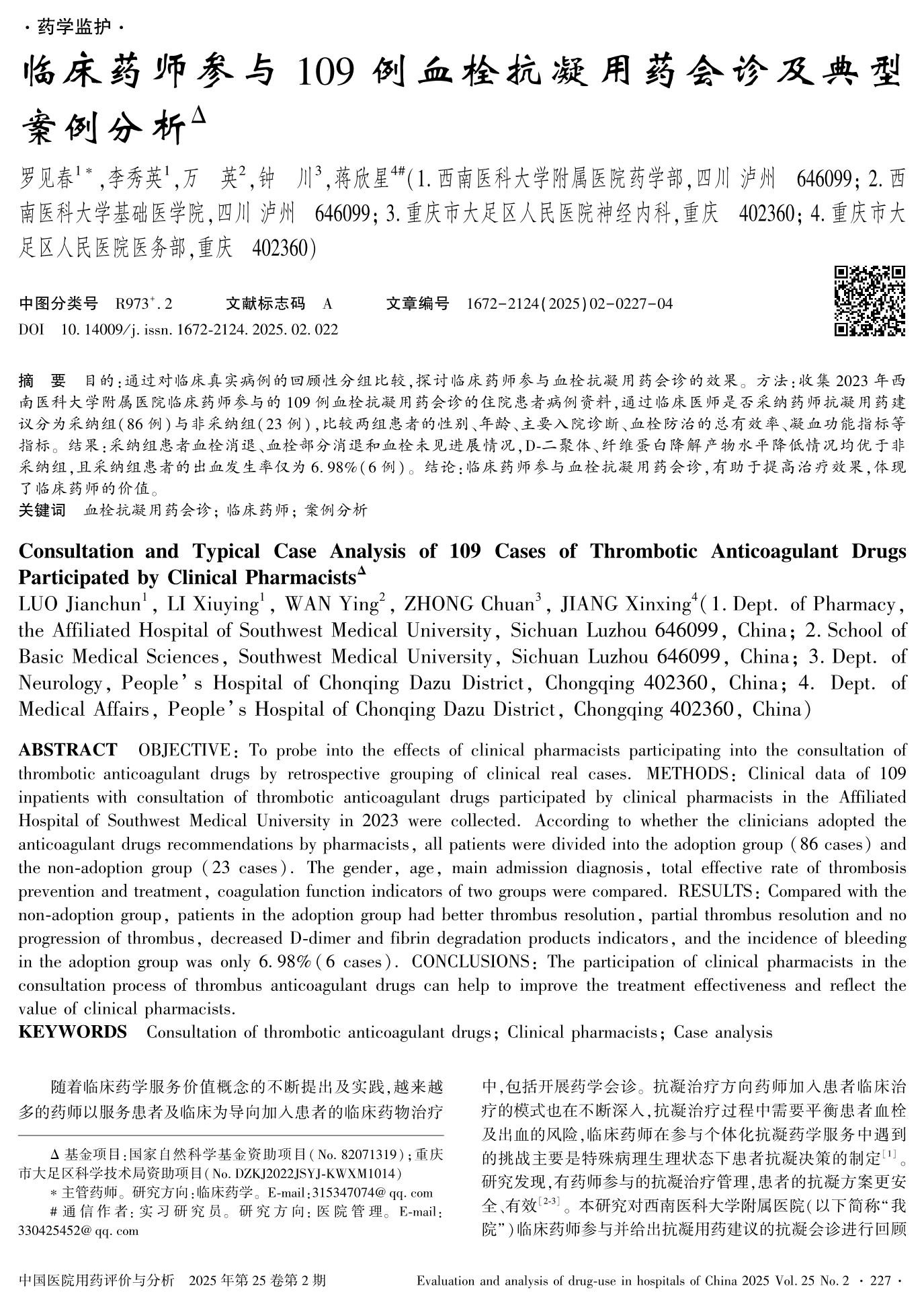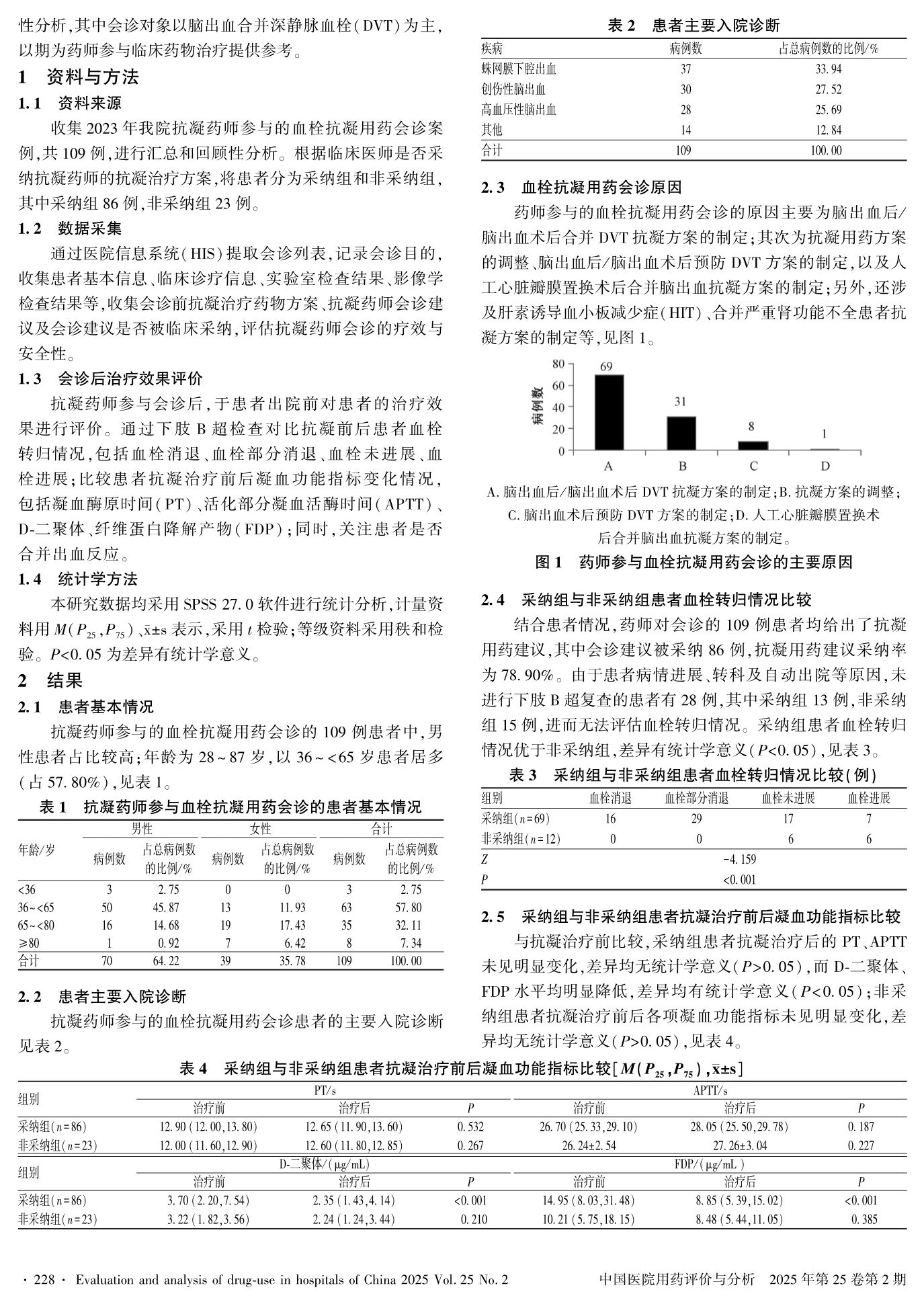 臨床藥師參與109例血栓抗凝用藥會診及典型案例分析