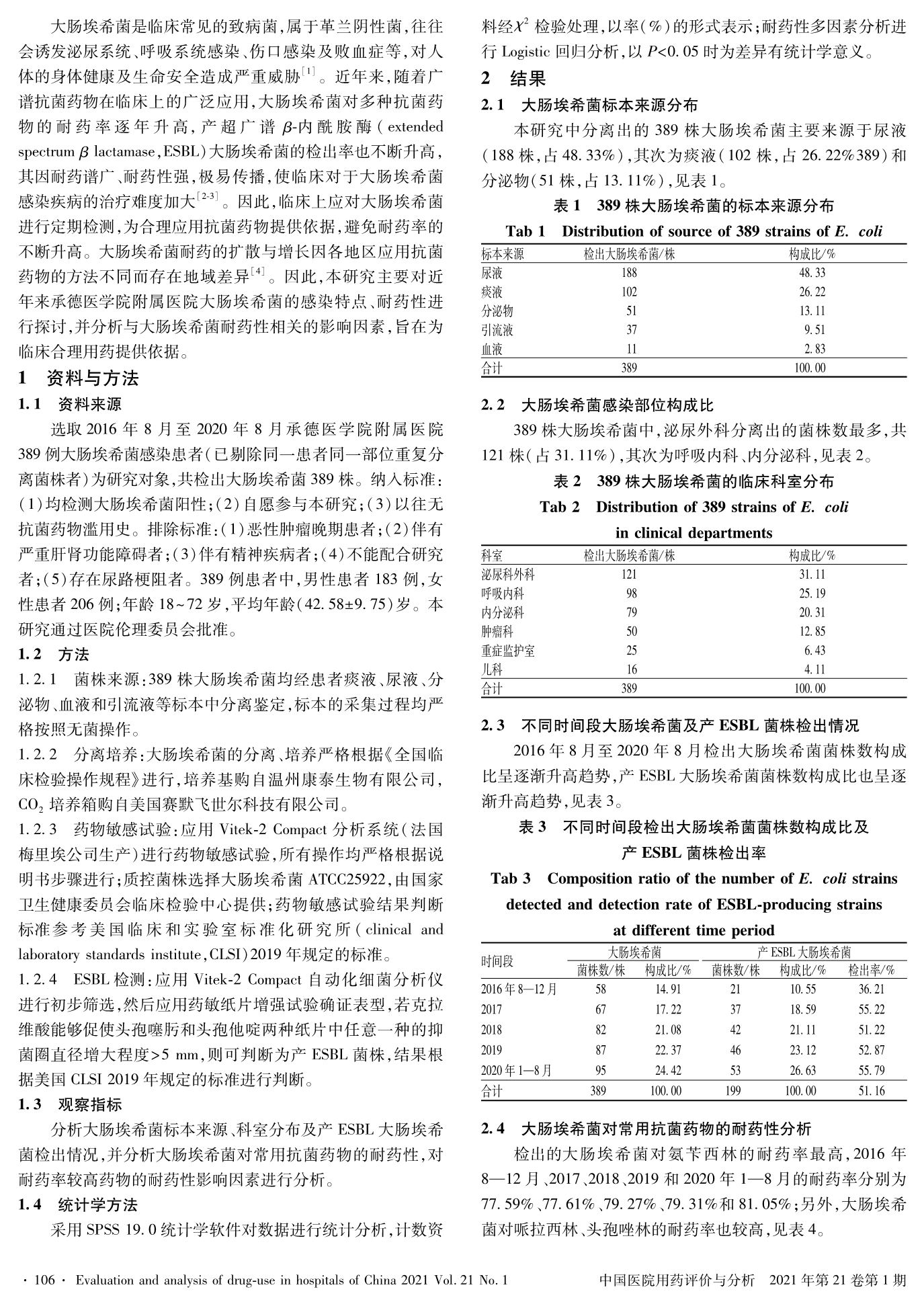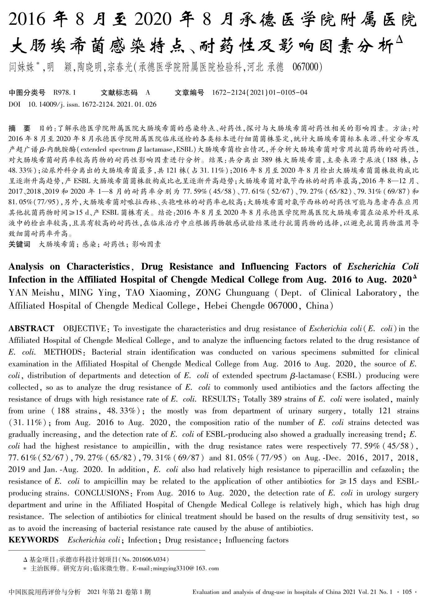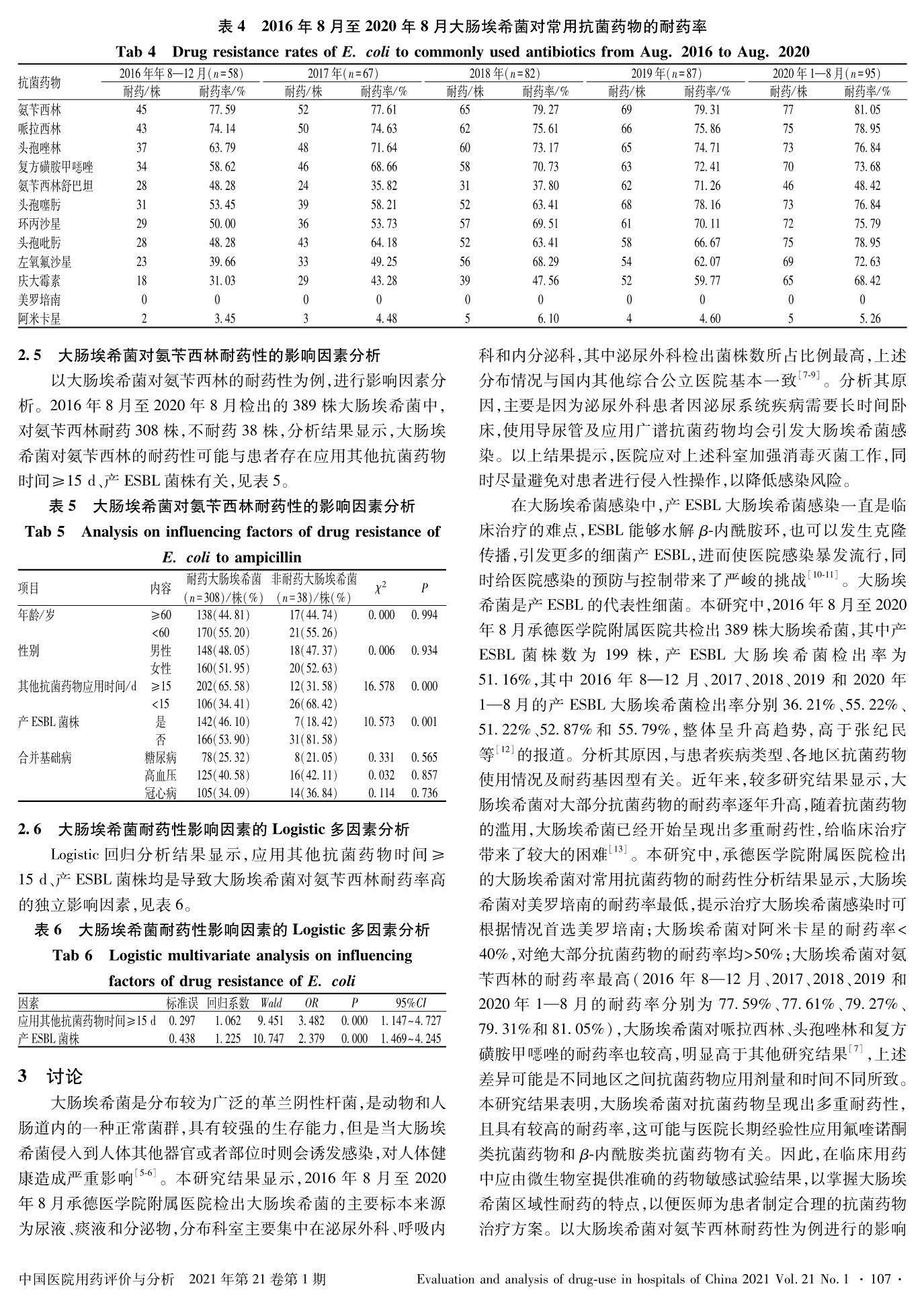 2020年8月承德醫(yī)學(xué)院附屬醫(yī)院大腸埃希菌感染特點(diǎn)、耐藥性及影響因素分析