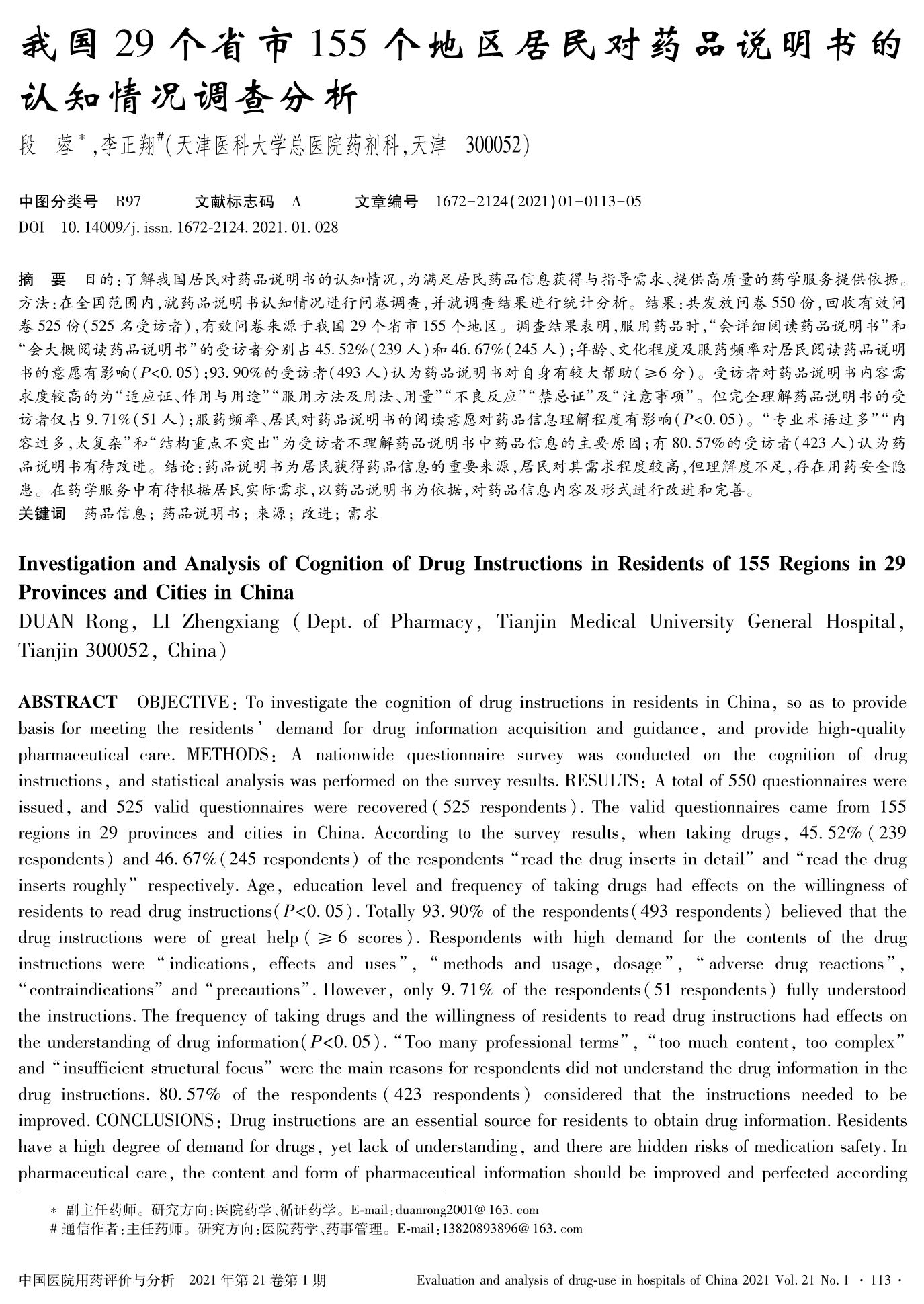 我國29個省市155個地區(qū)居民對藥品說明書的認知情況調(diào)查分析