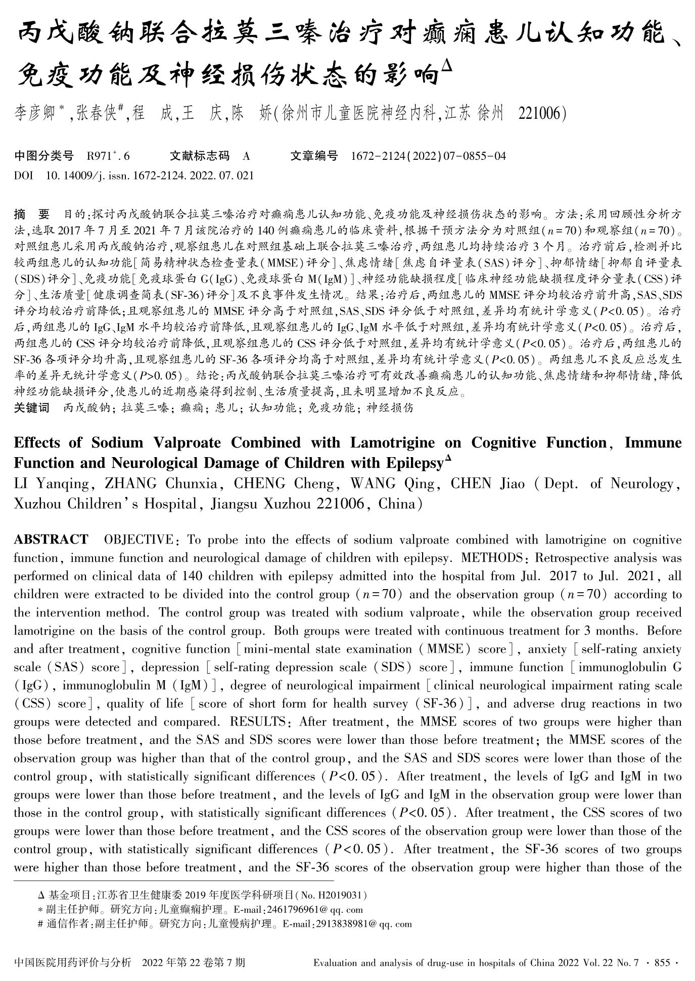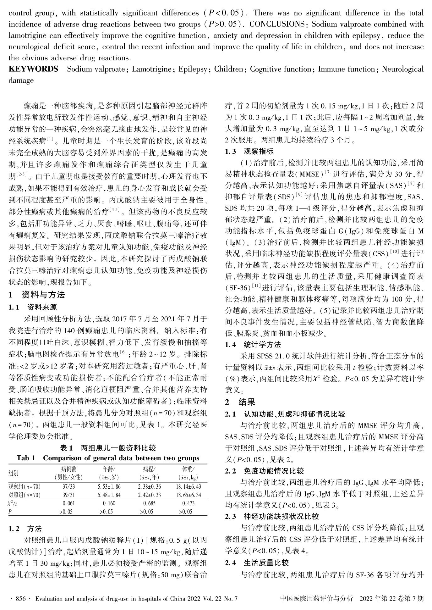 丙戊酸鈉聯(lián)合拉莫三嗪治療對癲癇患兒認(rèn)知功能、免疫功能及神經(jīng)損傷狀態(tài)的影響