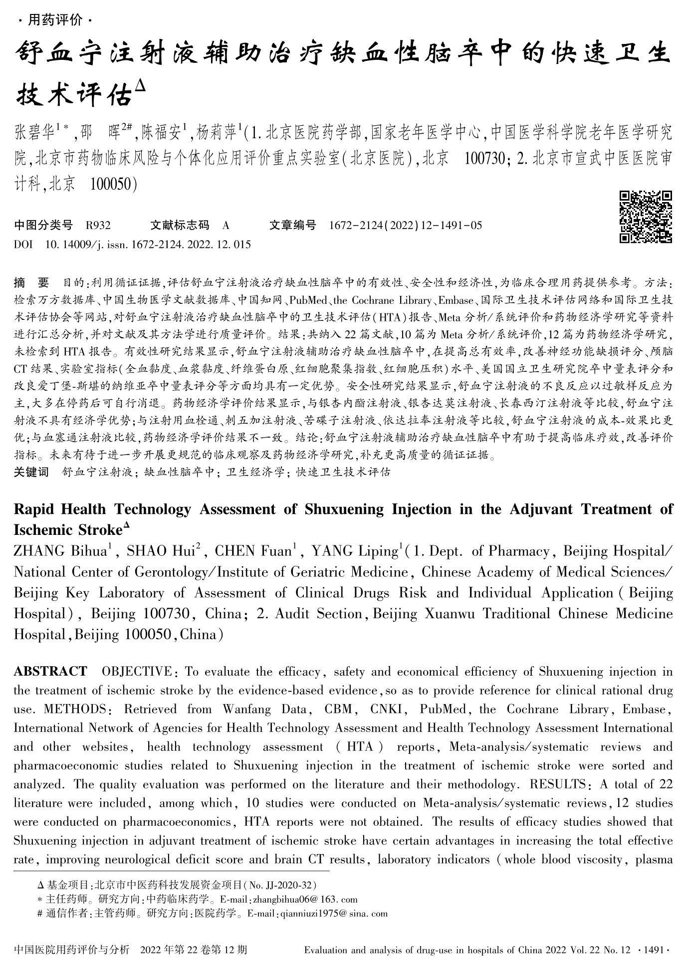 舒血寧注射液輔助治療缺血性腦卒中的快速衛(wèi)生技術(shù)評估