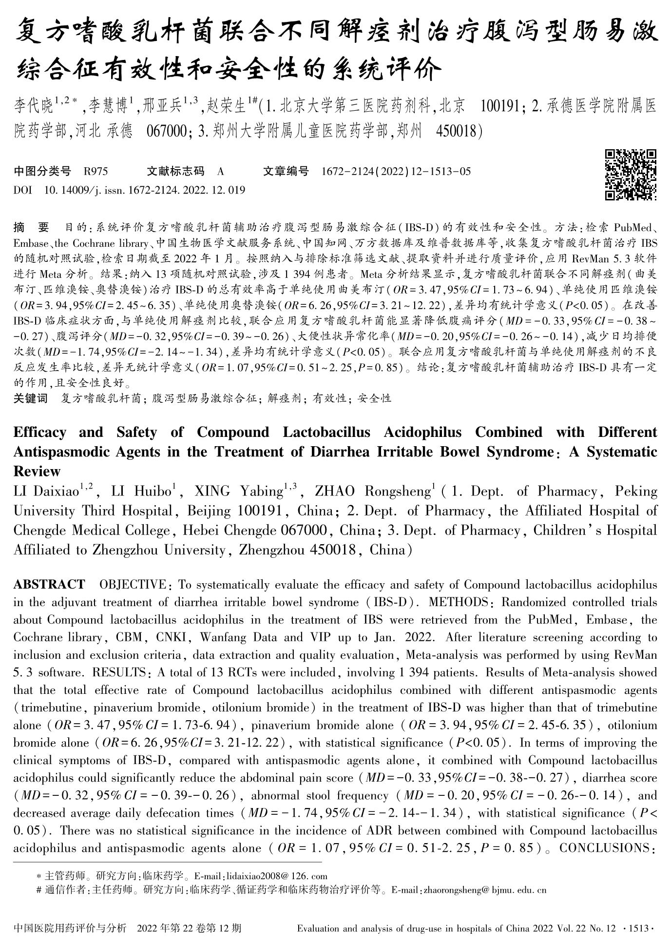 復(fù)方嗜酸乳桿菌聯(lián)合不同解痙劑治療腹瀉型腸易激綜合征有效性和安全性的系統(tǒng)評(píng)價(jià)
