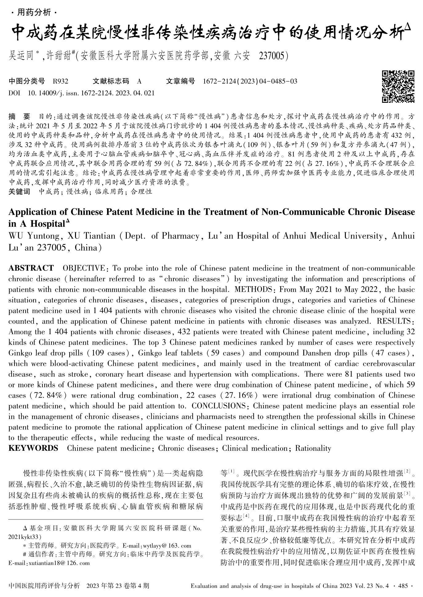 中成藥在某院慢性非傳染性疾病治療中的使用情況分析