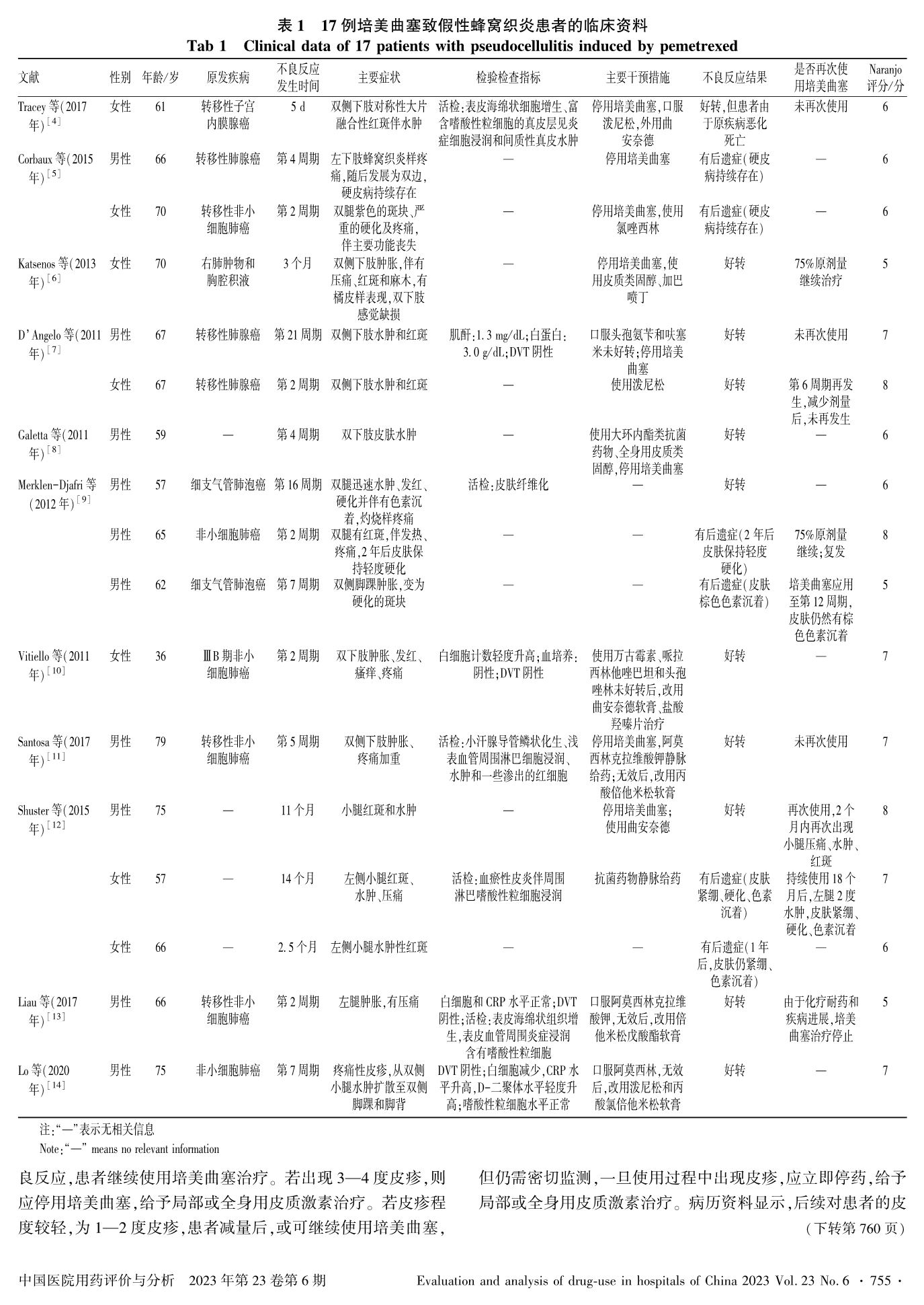 培美曲塞致假性蜂窩織炎的罕見不良反應(yīng)病例綜合分析
