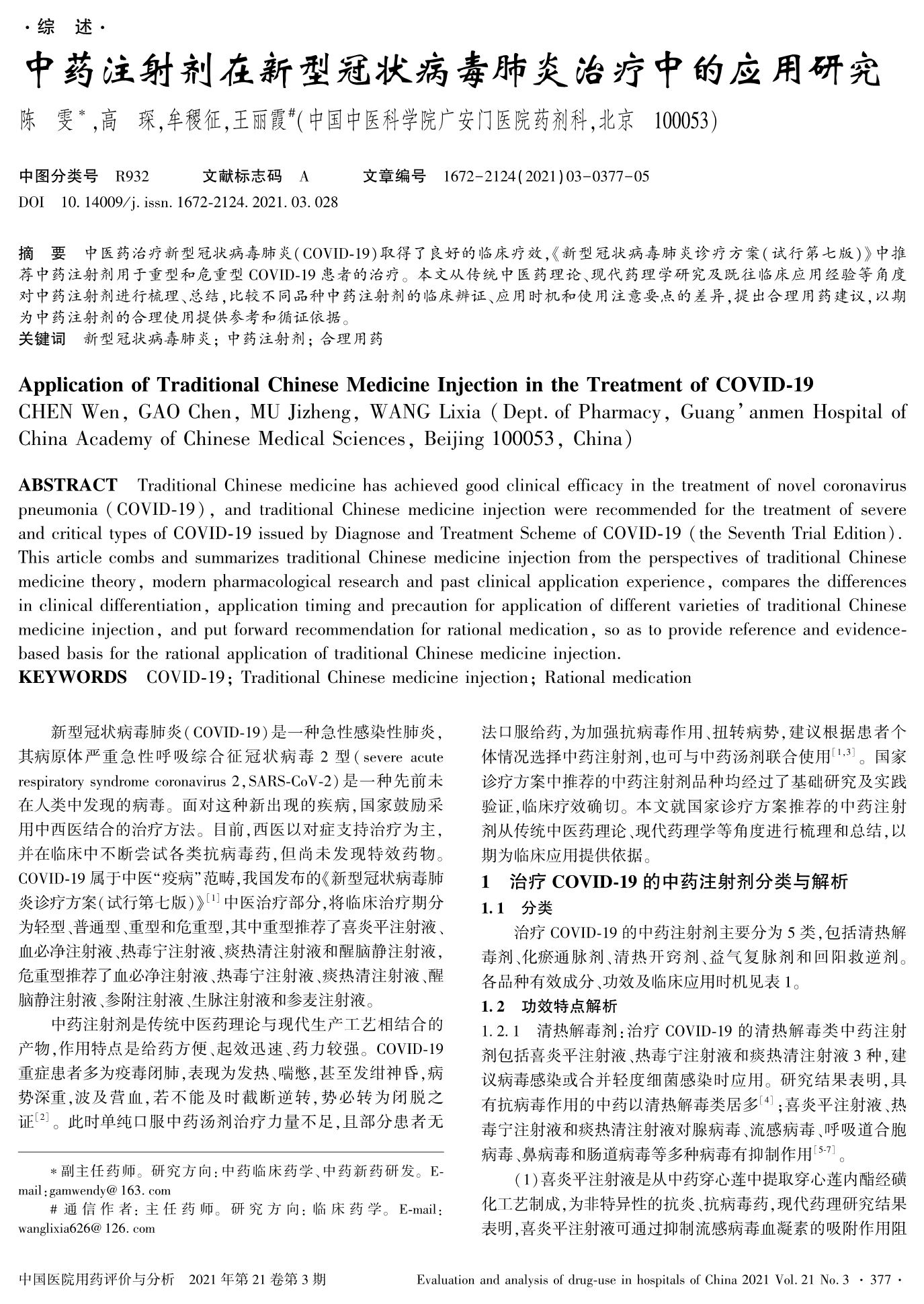 中藥注射劑在新型冠狀病毒肺炎治療中的應(yīng)用研究